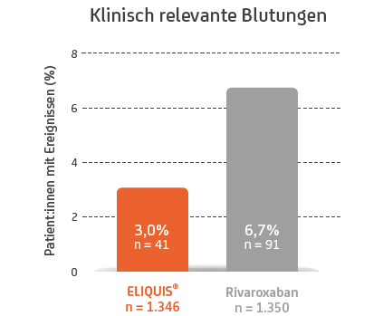 Innerhalb von 3 Monaten traten bei 41 von 1.346 Patient:innen (3,0 %) des ELIQUIS®-Armes und bei 91 von 1.350 Patient:innen (6,7 %) des Rivaroxaban-Armes klinisch relevante Blutungen‡ auf.1,4 Das entsprach einer Risikoreduktion um mehr als 50 %* (Odds Ratio [OR] = 0,44; 95 %-Konfidenzintervall [KI]: 0,30–0,63; p < 0,0001).1