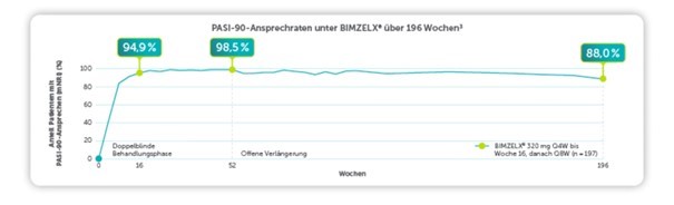 Abb. 1: PASI-90-Ansprechenraten unter Bimekizumab über 196 Wochen3