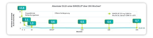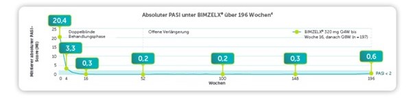 Abb. 2: Absoluter PASI unter Bimekizumab über 196 Wochen.4