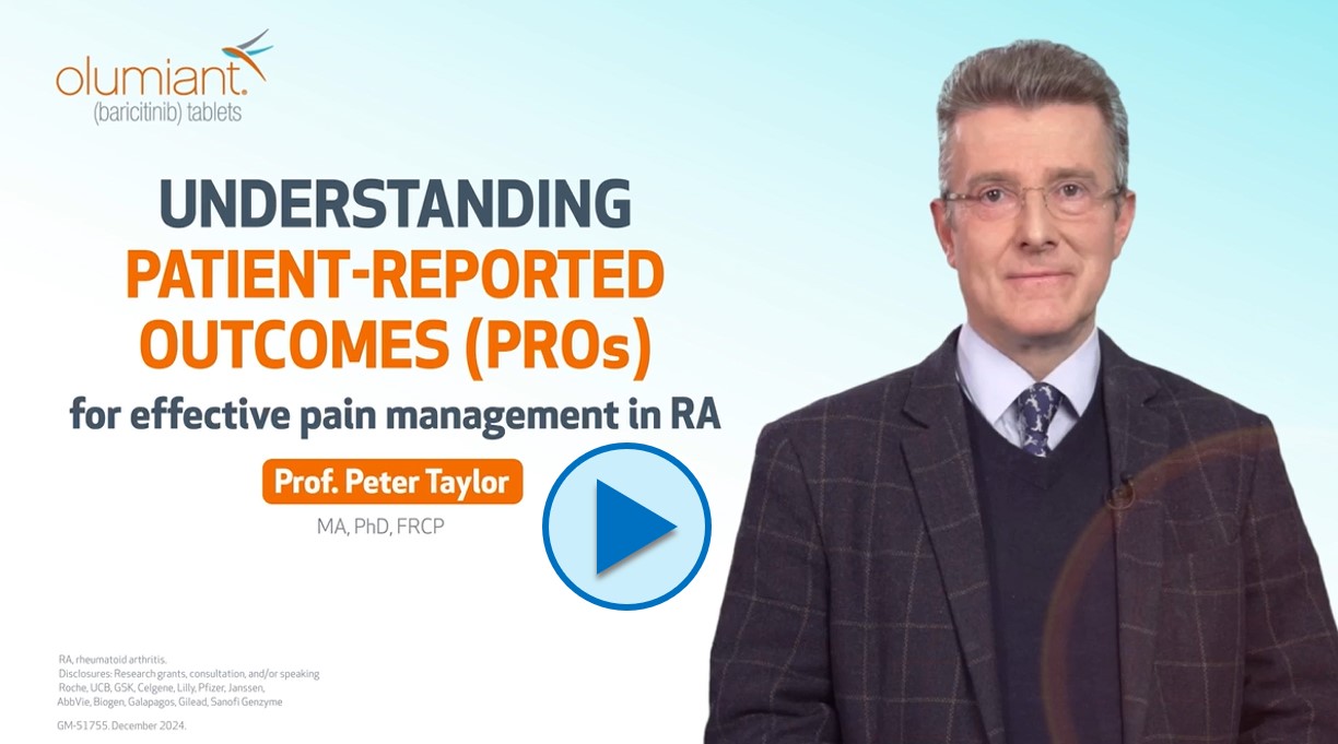 Für Patient:innen mit rheumatoider Arthritis (RA) sind Schmerzen eines ihrer größten Probleme. Olumiant® kann wirksame Schmerzlinderung bei mittelschwerer bis schwerer RA bieten.3,4 Prof. Peter Taylor beschreibt in einem Video effektives Schmerzmanagement durch Verständnis von Patient-Reported Outcomes (PROs).