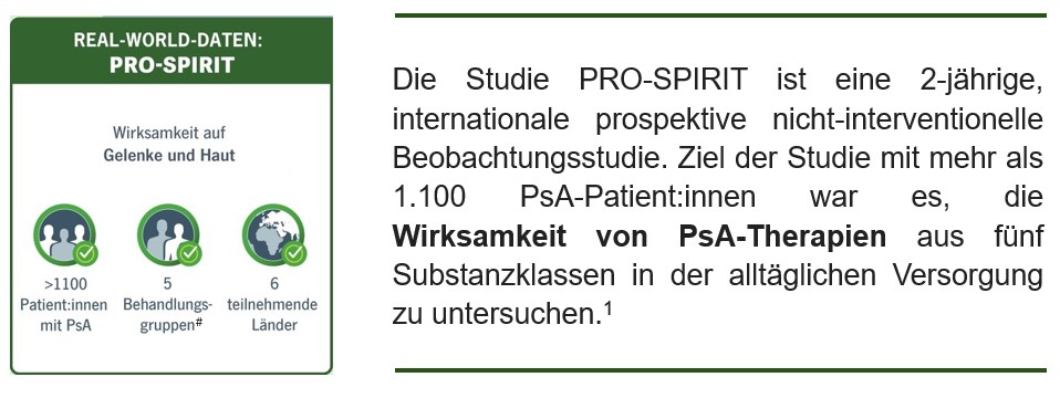 Real-World-Daten (RWD) sind eine wertvolle Ergänzung zu klinischen Studien. Sie bilden die Versorgungsrealität besser ab, da sie ein breites Patient:innenkollektiv umfassen und können für die Behandelnden eine wertvolle Hilfe bei Therapieentscheidungen sein. In der Real-World-Studie PRO-SPIRIT° stehen verschiedene Therapien bei Psoriasis-Arthritis* (PsA) auf dem Prüfstand. Welche Unterschiede bestehen in der Wirksamkeit?