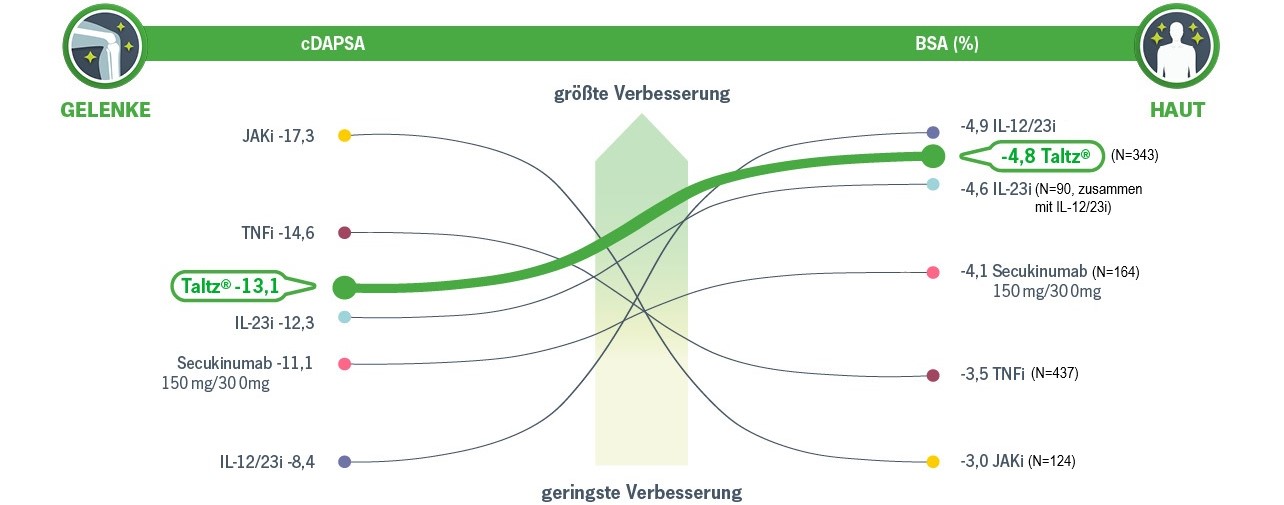 Darüber hinaus positionierte sich Taltz® auch innerhalb der IL-17A-Inhibitor-Substanzklasse: Verglichen mit Secukinumab (150mg/300mg) wurden mit Taltz® in den zentralen Domänen Gelenke und Haut größere Verbesserungen erreicht (Abb. 2).1