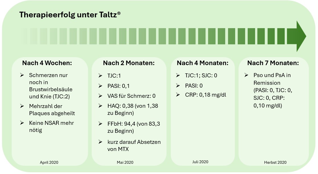 2019 stellte sich die damals 59 Jahre alte Patientin erstmals bei Dr. Christina Binder-Jovanović, Rheumatologin aus München, vor. Ein MRT ergab eine erosive Osteochondrose im Bereich LWK5/S1 mit einem Bandscheibenprolaps. Die Patientin äußerte den Wunsch eines Medikamentenwechsels, da sie durch die MTX-Therapie unter einer leichten Abgeschlagenheit und Kopfschmerzen litt sowie häufig an Infekten der oberen Luftwege und Harnwege erkrankte. Dr. Binder-Jovanović empfahl jedoch zunächst, die MTX-Therapie mit einer reduzierten Dosis von 10 mg wöchentlich oral weiterzuführen. Durch die Dosisreduktion kam es jedoch zu einem erneuten Schub: Anfang 2020 kehrte die Psoriasis in voller Stärke zurück: Ihr PASI (Psoriasis Area and Severity Index) stieg von 4,0 im Januar auf 7,2 im Februar stark an. Auch der Genitalbereich war betroffen.